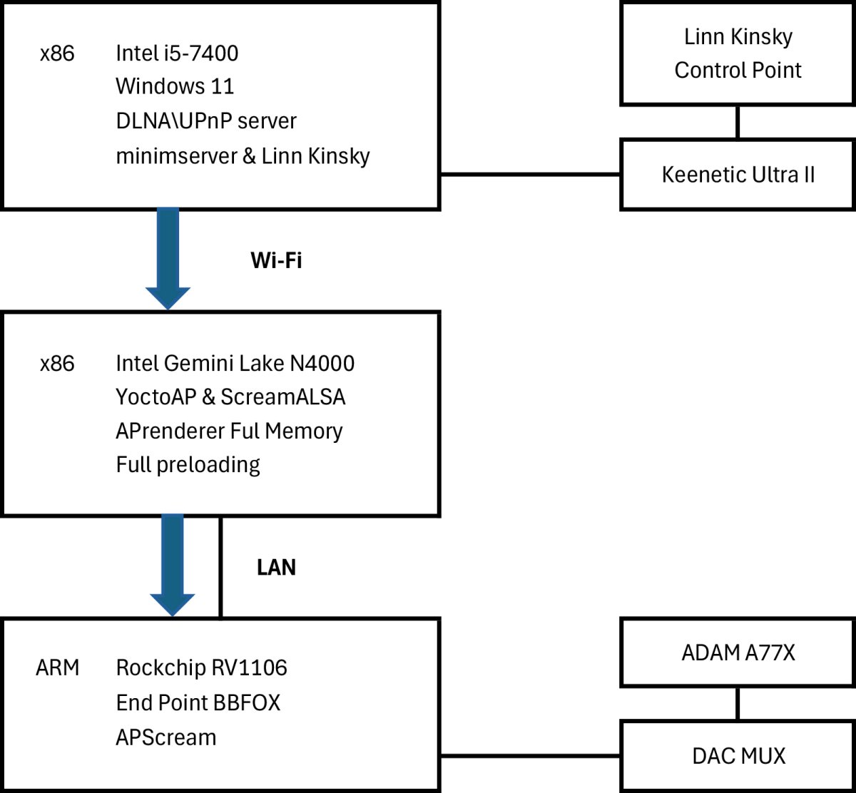 Виктор, приветствую! Полностью разделяю данный подход. Сам последние годы использую тракт из трёх аппаратов. И очень доволен. Особенно хорошо зашёл переход на связку актуальной версии драйвера ScreamALSA и ресивера APscream. А вчера, минуя свитч, настроил прямое кабельное соединение между промежуточным сервером и конечной точкой, так звучание, на мой взгляд, стало вообще высший пилотаж! Качественные записи, где действительно есть что послушать, звучат просто шедеврально.