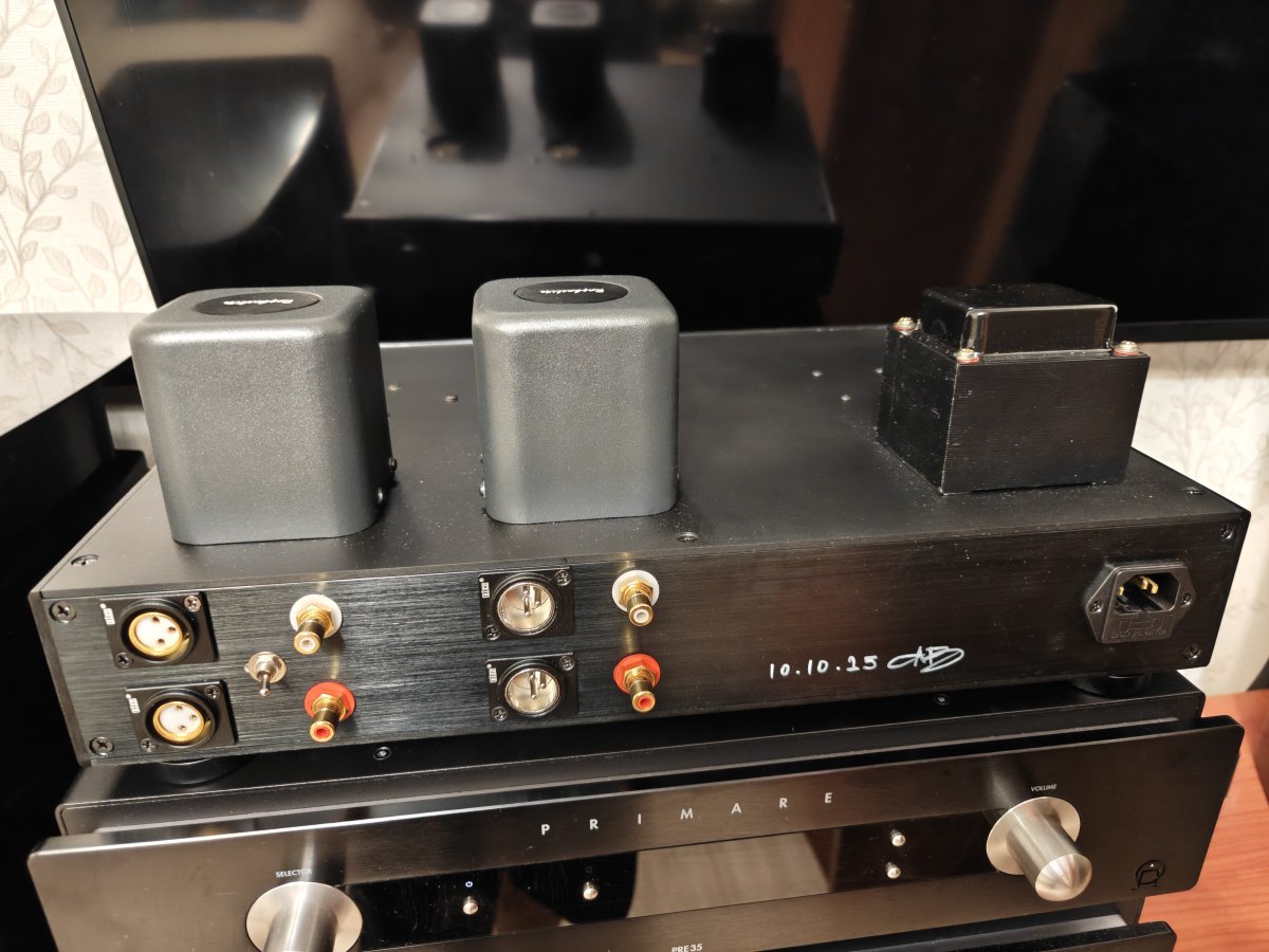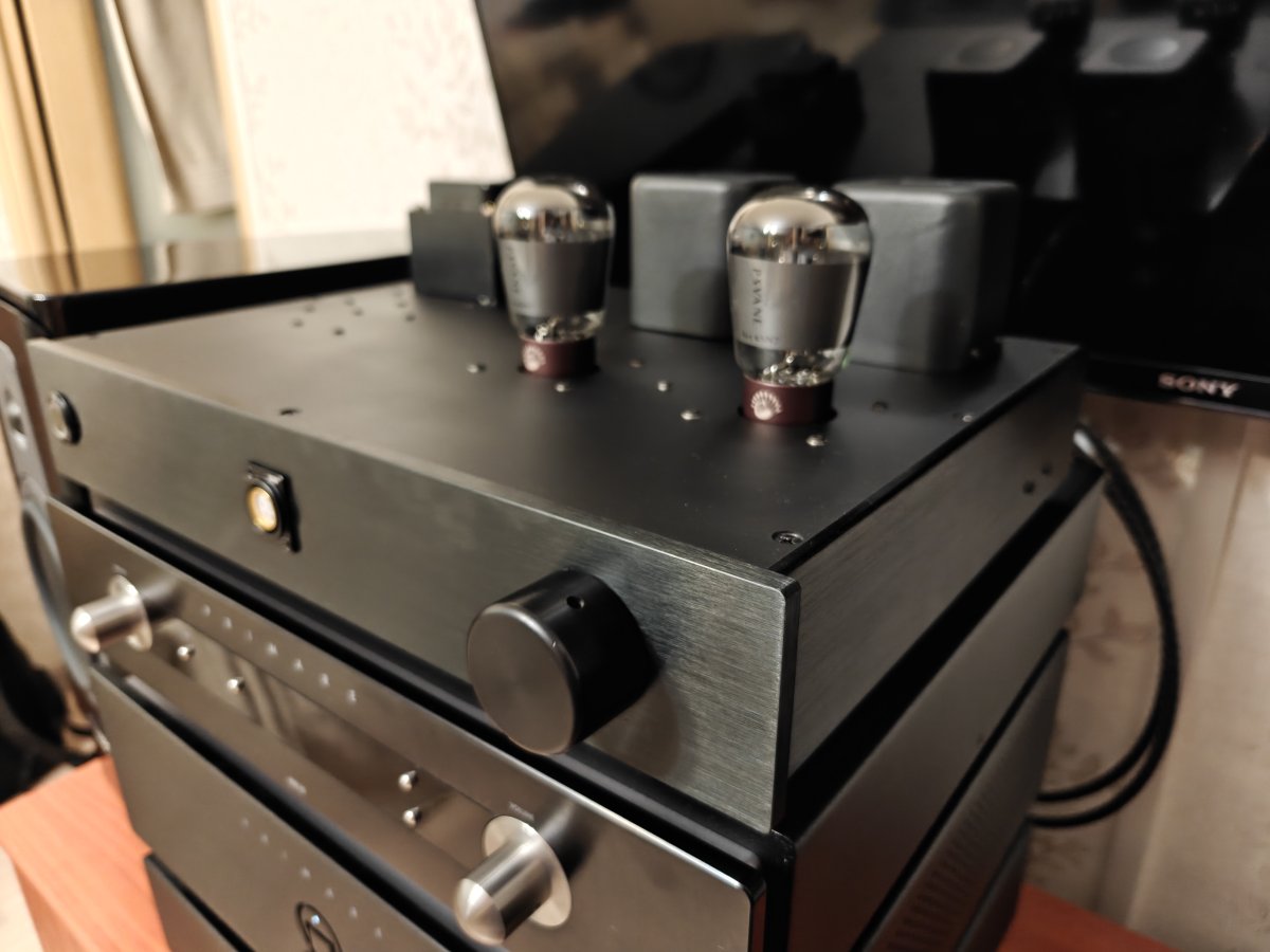 Да, выглядит этот кастомный усилок мощно, за счёт корпуса из толстенных плит алюминия, при этом, балансный он, или нет, не очень понятно, так как XLR входы и выходы могут просто дублировать RCA входы и выходы, так что по данному вопросу требуется уточнение. Из ламп вижу, вроде бы, пару сдвоенных триодов PSVANE ART 6SL7-TIII, по крайней мере в таком исполнении мне только они встречались, но кенотрон не наблюдаю, что говорит о наличии диодного моста в БП. И у усилителя две недели тому назад был юбилей - 10 лет, солидно. Хотелось бы услышать какие-то подробности по усилителю :think: