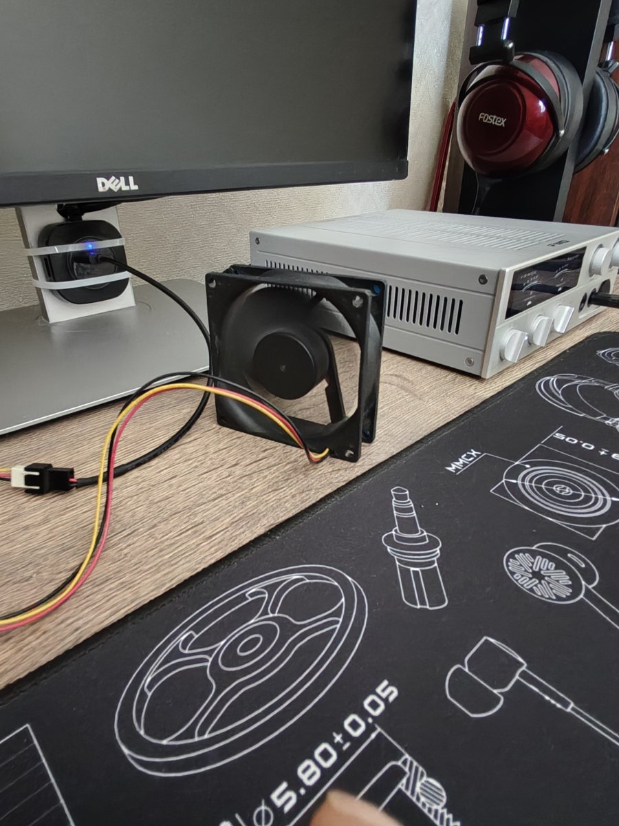 Ну сейчас в этом нет нужды. Вот когда дома летом будет +35, тогда можно будет включить вентилятор и лучше с другой стороны. Там транзисторы и именно они выделяют все тепло. С этой стороны закрытый трансформатор, его нет необходимости обдувать.