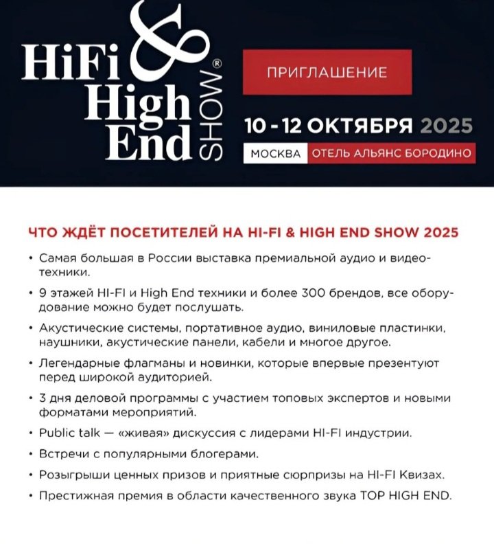 Регистрация на флагманскую выставку аудио и видеотехники высокого класса Hi-Fi & High End Show Москва уже началась! Легендарное событие состоится 10-12 октября 2025 года в столичном отеле «Альянс Бородино», и это будет по-настоящему ярко и громко!