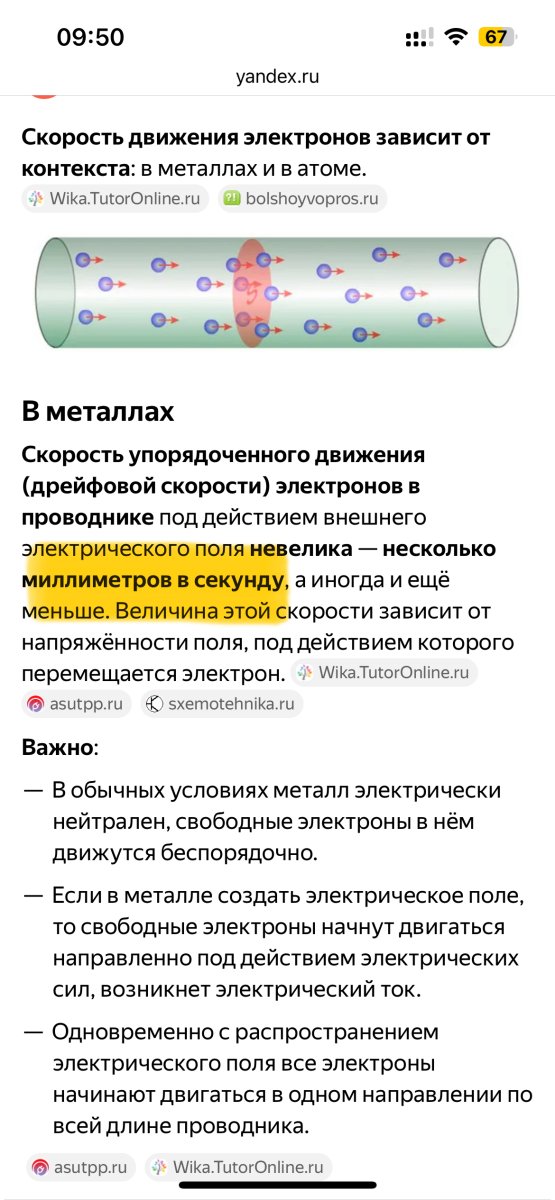 И насчёт скорости движения носителей заряда. Она конечно на порядки выше, чем миллиметр в секунду. Вы представляете, при такой скорости вы подключаете наушники к усилителю метровым кабелем, а звук появляется только через 1000 секунд! Вот был бы прикол!