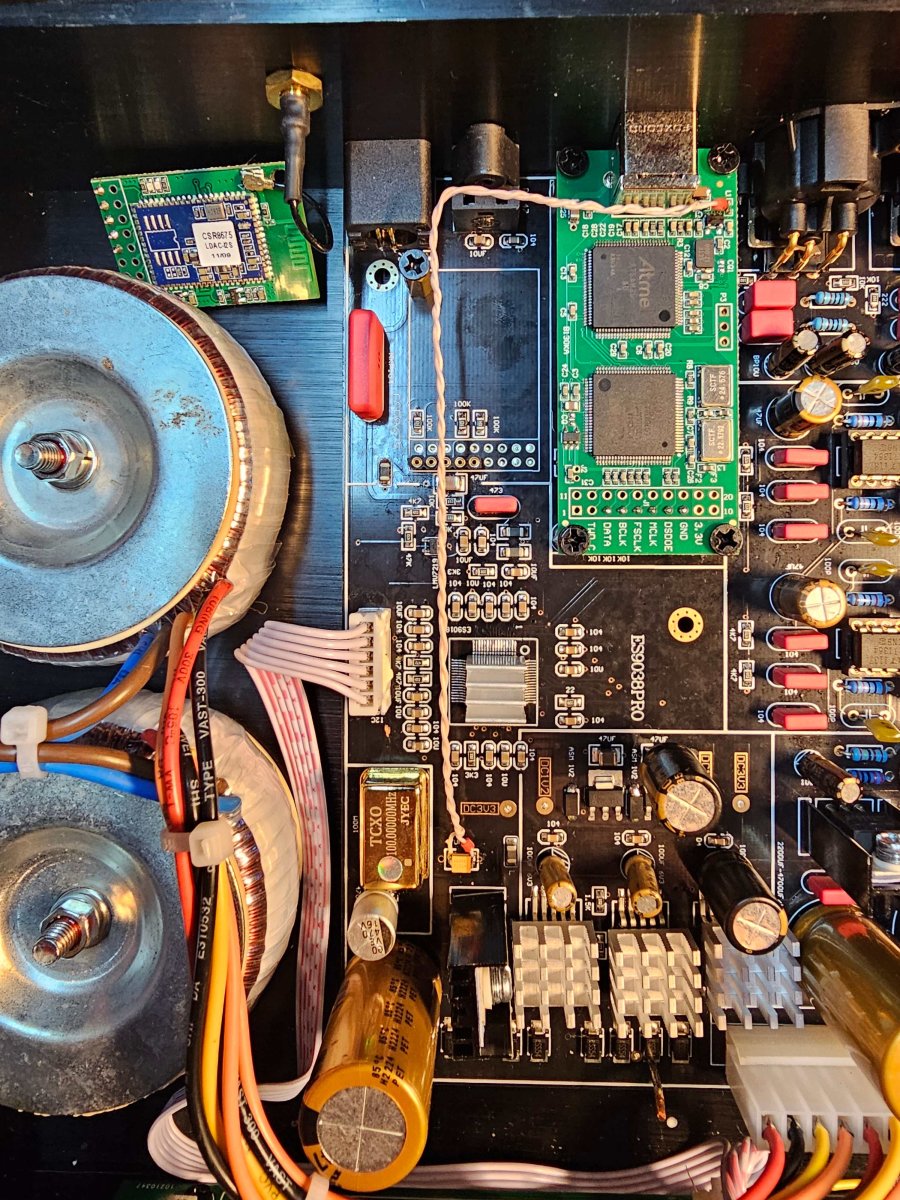 Вынутый модуль Bluetooth, запитка модуля Amanero от внутреннего стабилизатора, в будущем нужно будет добавить отдельный малошумящий, и провод USB из двух коаксиальных кабелей.