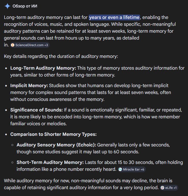Слуховая память бывает кратковременной и долговременной.